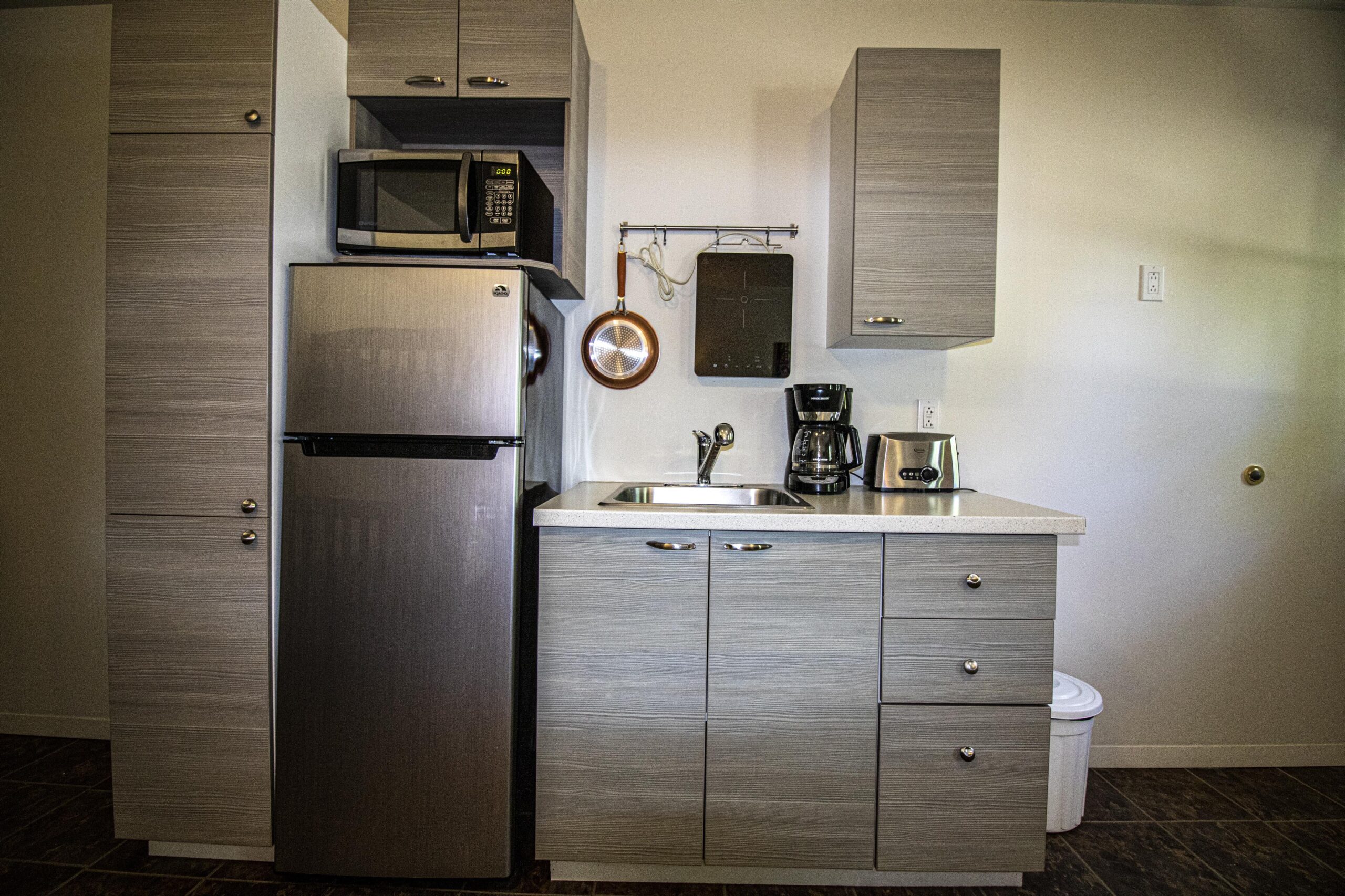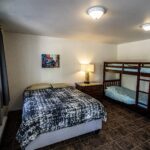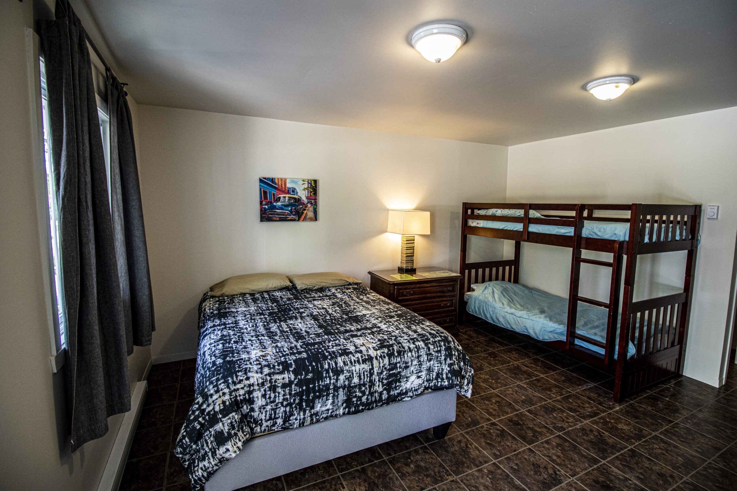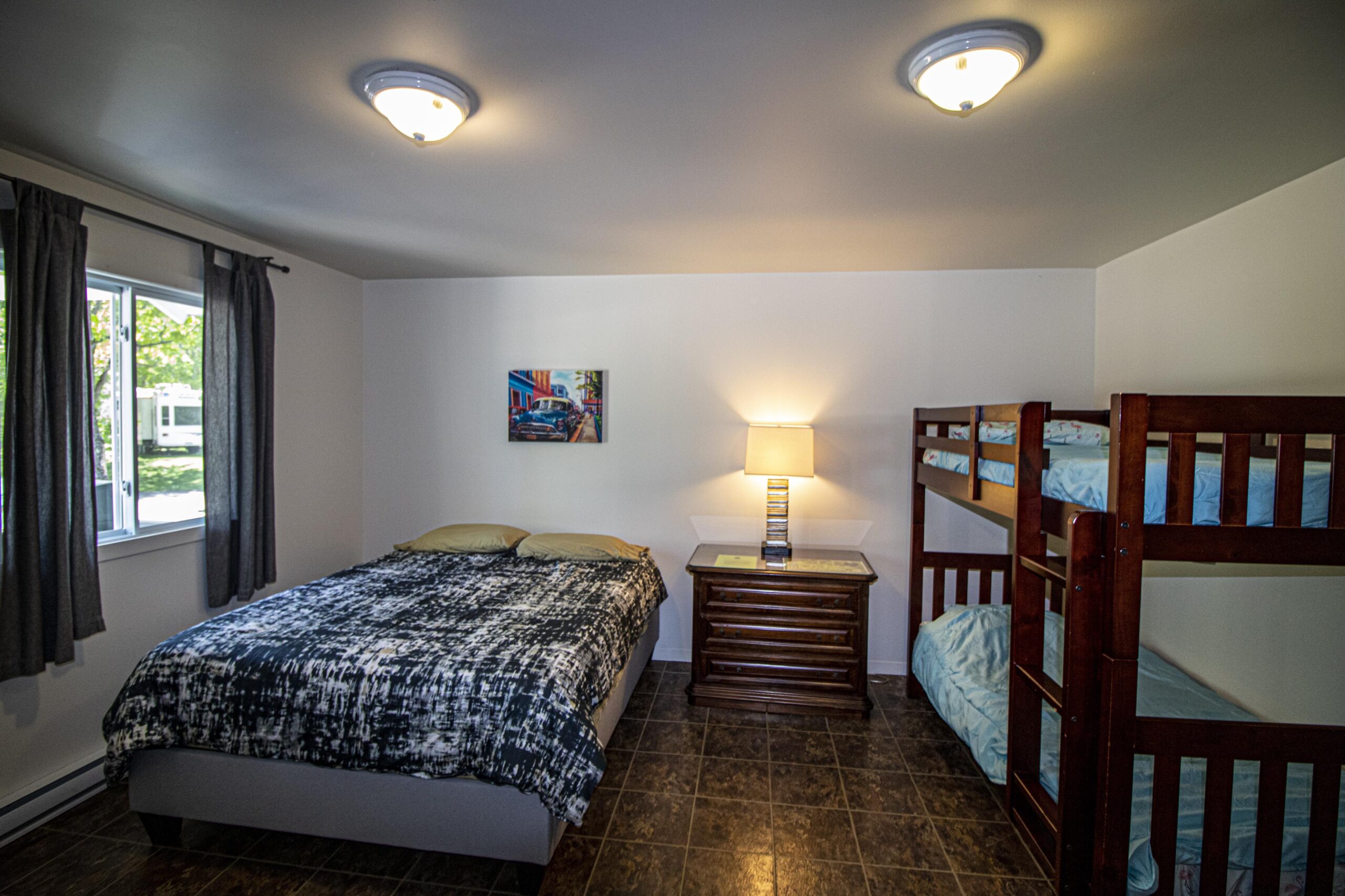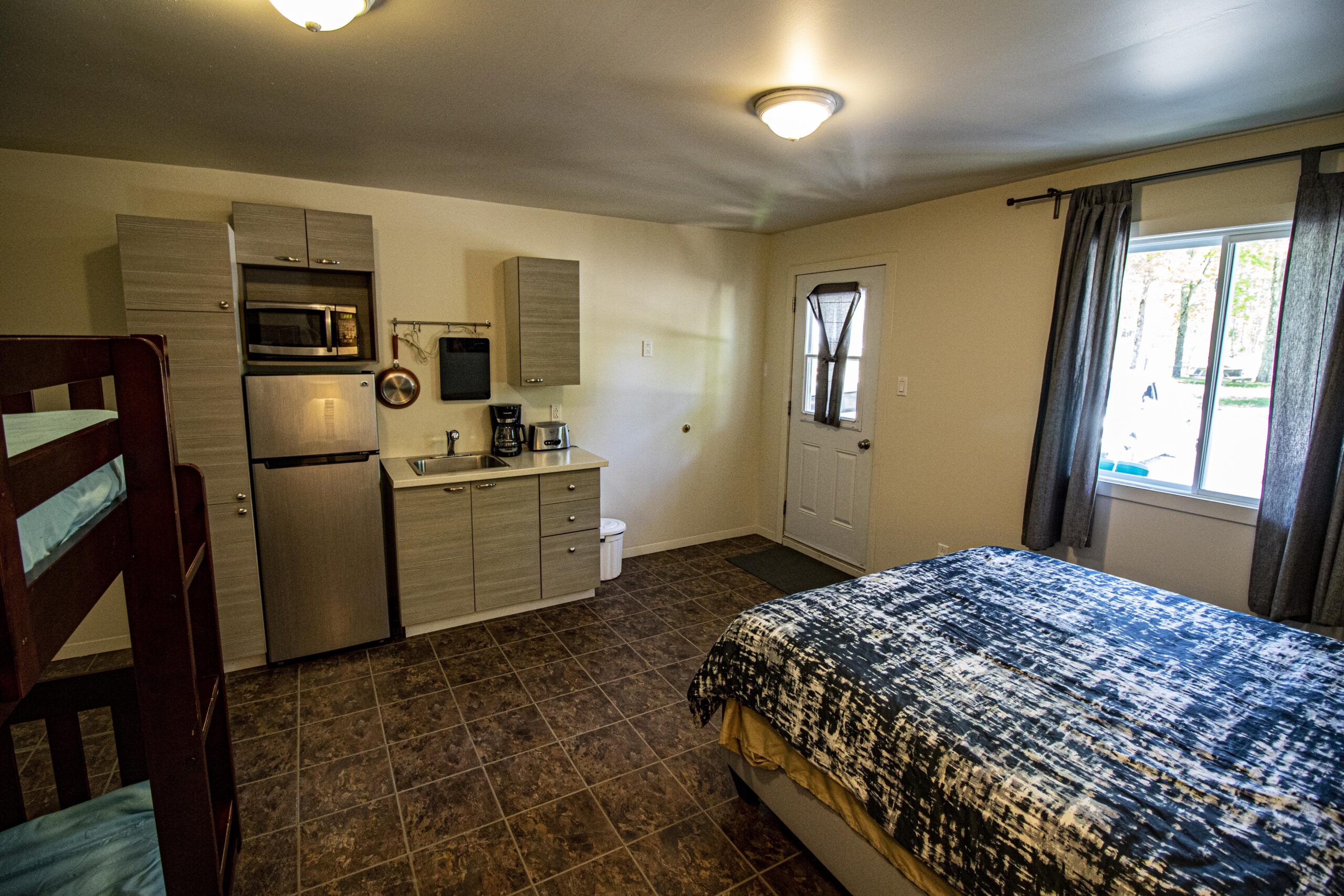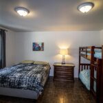 Lit queen et lit superposé simple avec service de literie $ sur demande, mini cuisine avec réfrigérateur de grandeur moyenne, micro-onde, cafetière, grille-pain, plaque à induction à un rond, ustensiles, chaudrons et vaisselles, BBQ (propane fourni), linge et savon à vaisselle. Salle de bain avec douche et papier de toilette. À l’extérieur, il y a aussi une table à pique nique et un rond de feu.