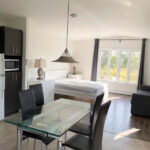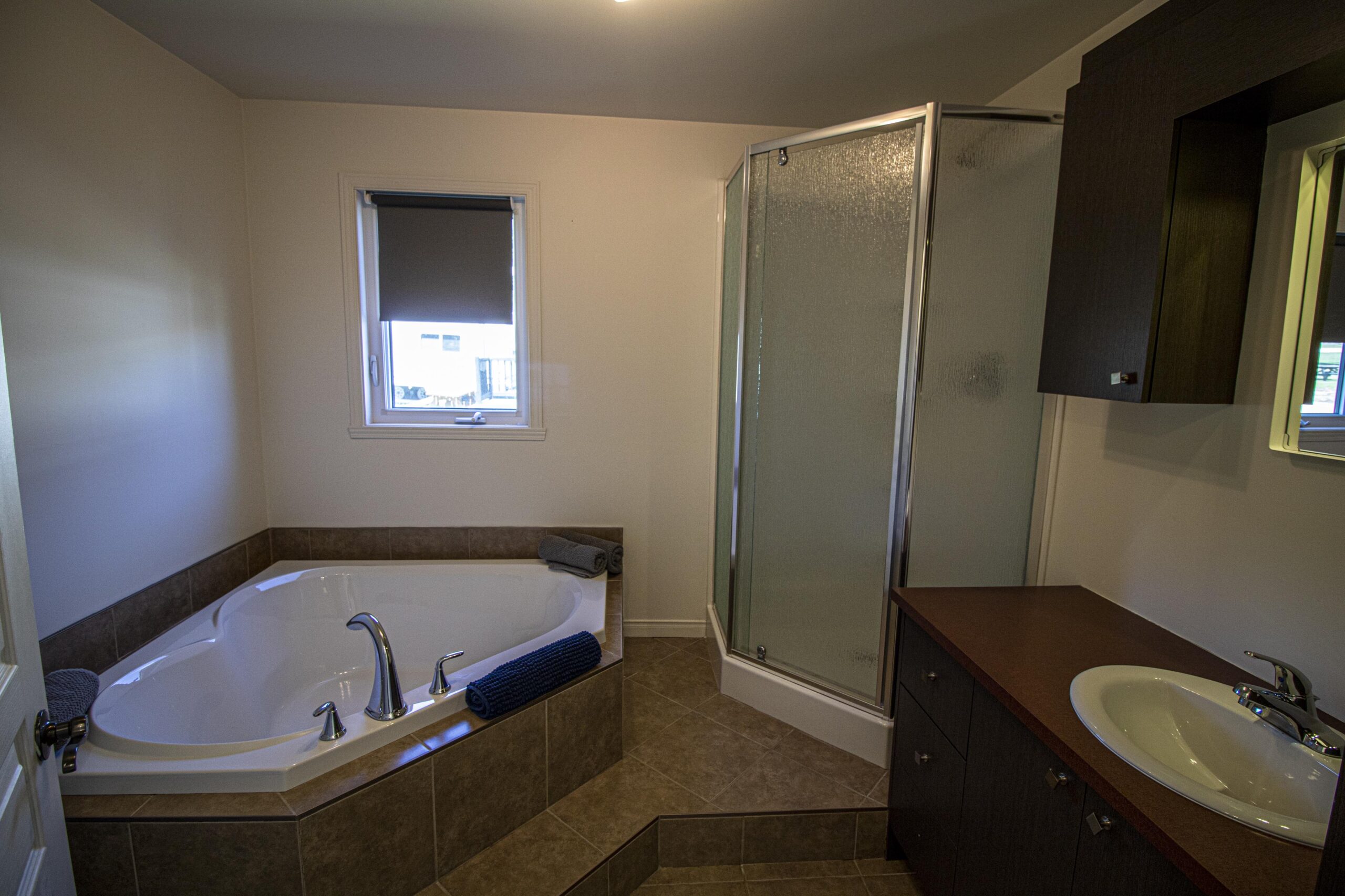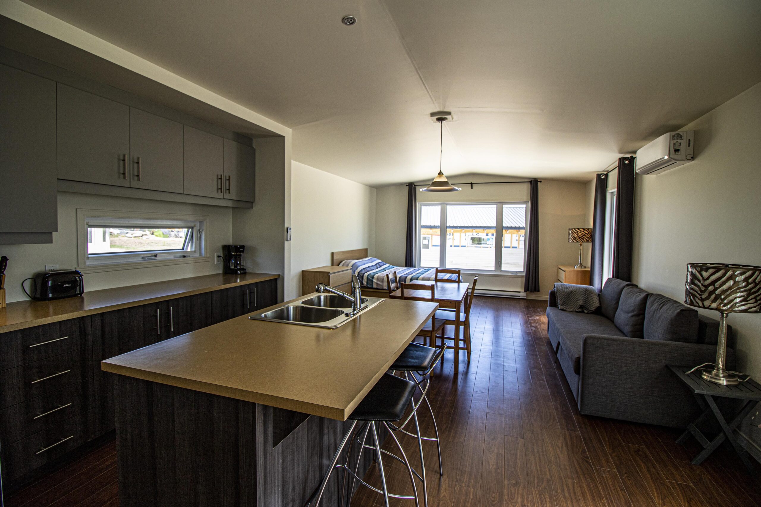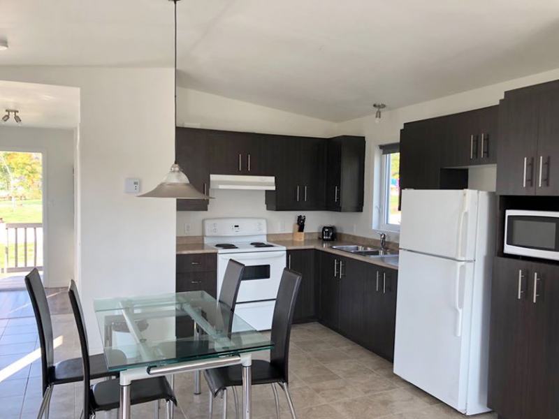 Un lit queen et un divan lit queen avec service de literie $ sur demande, une cuisine complète à aire ouverte avec vaisselles, ustensiles, four, frigidaire, micro-onde, cafetière, grille-pain, chaudrons, un BBQ (propane fourni), linge et savon à vaisselle. Une salle de bain avec douche et papier de toilette. À l’extérieur, il y a aussi une table à pique nique et un rond de feu.